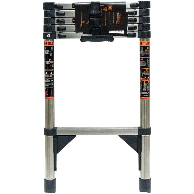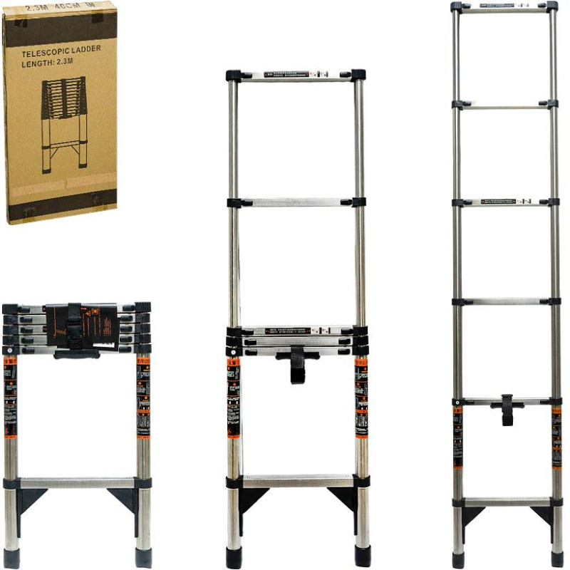 • Телескопічна драбина з нержавіючої сталі довжиною 2,3 м у розкладеному стані для роботи на висоті. Складається до компактного розміру та легко транспортується в багажнику автомобіля. Протиковзні накладки на щаблях та гумові упори забезпечують стійкість та безпеку під час роботи.